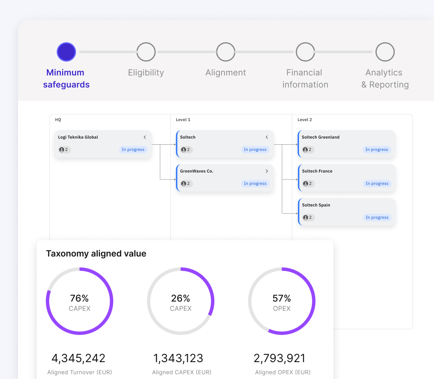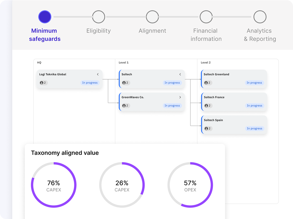 Run your end-to-end EU Taxonomy assessment, from eligibility and alignment assessments to the final auditable report